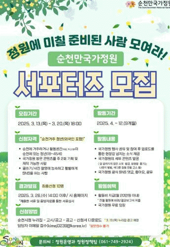 시 관계자는 “이번 국가정원 SNS 서포터즈 모집을 통해 정원의 다채로운 매력을 널리 알리고, 젊은 감각이 더해진 새로운 콘텐츠가 만들어지길 기대한다”며, “정원과 SNS 활동에 관심 있는 청년들의 적극적인 참여를 바란다”고 전했다.