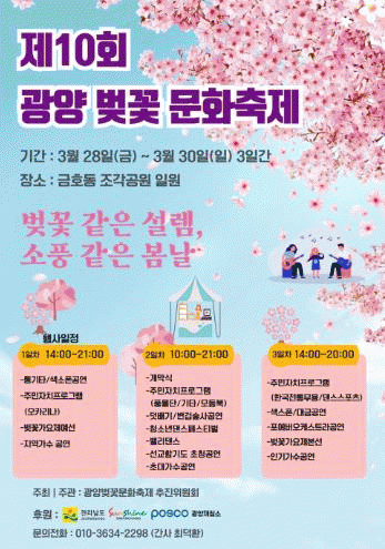 김종현 광양벚꽃문화축제추진위원장은 “관광객들이 보고, 느끼고, 맛보고, 즐길 수 있는 축제가 되도록 최선을 다해 준비하고 있다”며 “광양시를 대표하는 금호동 벚꽃길에서 봄의 정취를 만끽하며 소중한 추억을 만들어 가시길 바란다”고 밝혔다.