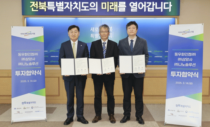 전북특별자치도는 14일 군산시, 익산시와 함께 동우화인켐㈜, ㈜삼양사, ㈜나노솔루션과 847억 원 규모의 투자협약을 체결했다.