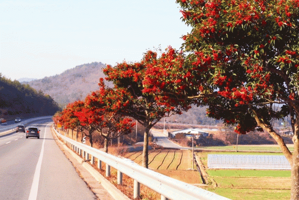해남군을 관문인 국도 13호선 계곡면 공룡 상징물~해남교차로 구간 먼나무의 빨간 열매가 주렁주렁 장관이다. 먼나무는 해남군 대표 가로수로 계곡면 입구에 1,524주가 식재되어 해남을 찾는 이들에게 좋은 첫인상을 남기고 있다.