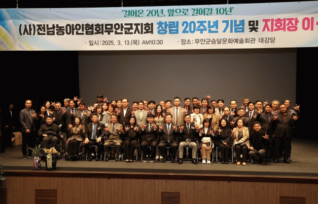 이번 행사는 전남농아인협회 백성구 회장 등 200여 명의 내빈이 했고, 무안군지회 창립 20주년 기념과 이관 전임회장의 노고를 치하하고 신임 정영철 지회장의 취임을 축하했다.