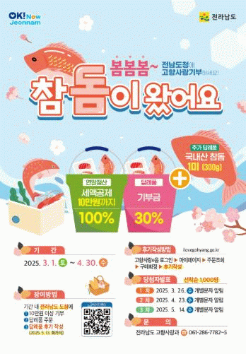 고미경 전남도 자치행정국장은 “이번 이벤트는 행운과 복을 불러오는 물고기라 불리는 도미처럼 기부자에게 행운이 가득하길 바라는 마음으로 마련한 행사”라며 “따스한 봄날을 맞아 고향에 사랑을 전하고 온 가족이 참돔으로 건강 챙기길 바란다”고 말했다.