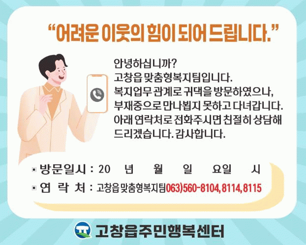이길수 고창읍장은 “가정방문 알림 스티커가 복지사각지대 발굴과 고독사 예방에 큰 도움이 될 것”이라며, “고창읍주민행복센터는 찾아가는 보건복지서비스를 보다 효과적으로 제공하기 위해 다방면으로 노력하겠다.”고 말했다.