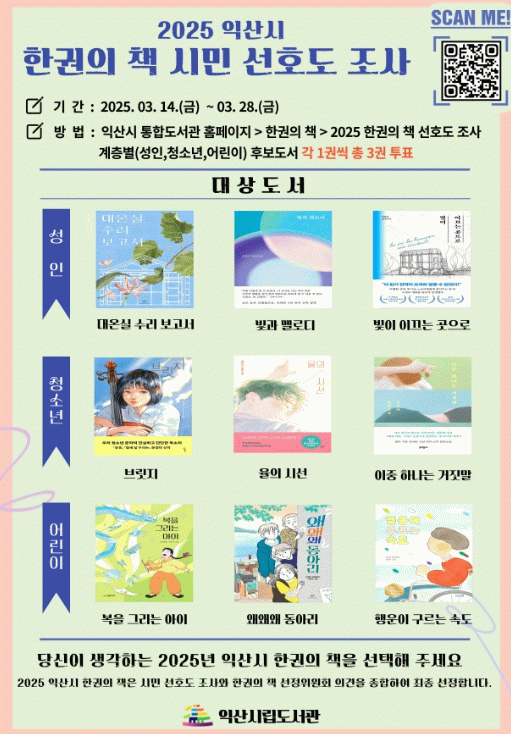 이번 선호도 조사는 익산시민 누구나 익산시 통합도서관 누리집에서 참여할 수 있고, 조사 결과와 선정위원회의 의견을 종합해 2025년 '한권의 책' 최종 도서가 확정된다.