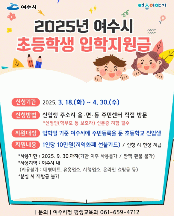 지원 대상은 초등학교 입학일(3월 4일) 기준 여수시에 주소를 두고 초등학교에 최초 입학한 학생이다.