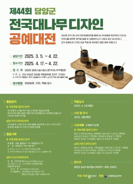 대나무디자인공예대전은 82년부터 43년간 한 해도 빠짐없이 개최해 온 유서 깊은 대나무공예 공모전으로 담양군이 주최 및 주관하고, 문화체육관광부가 후원한다.