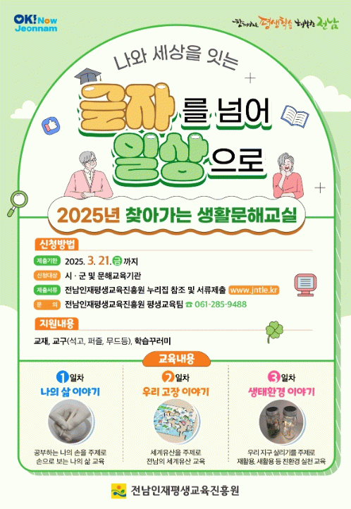 참여를 바라는 문해교육 기관은 오는 21일까지 해당 시군에 접수할 수 있으며, 자세한 사항은 전남인재평생교육진흥원 평생교육팀으로 문의하면 된다.