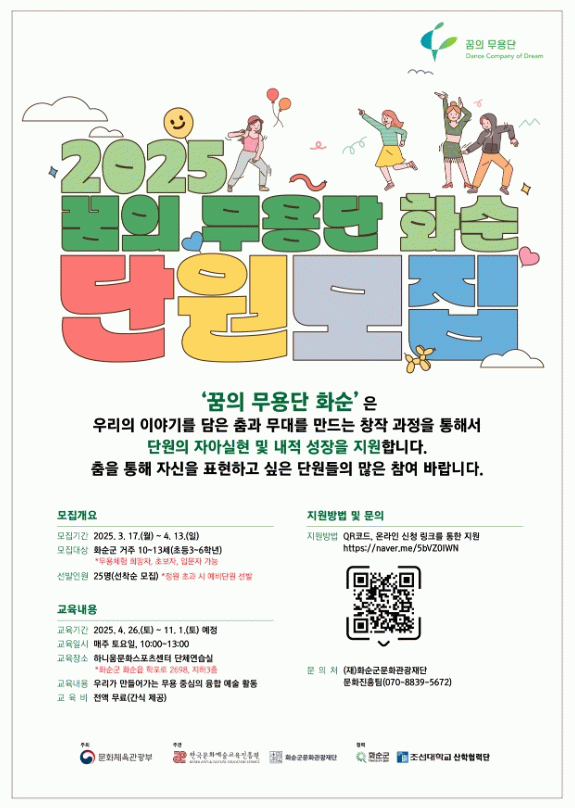 2025년 꿈의 무용단 화순 단원 모집 관련 내용은 (재)화순군문화관광재단 홈페이지에서 확인할 수 있으며, QR코드·온라인 신청 링크를 통해 지원할 수 있다.