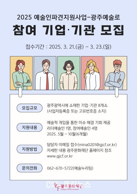 기업·기관의 공모기간은 3월 10일부터 23일까지며, 리더예술인은 3월 25일부터 4월 7일까지, 참여예술인은 4월 17일부터 30일까지다. 접수는 이메일(mina0201@gjcf.or.kr)을 통해 가능하며, 자세한 내용은 광주문화재단 홈페이지 공고문에서 확인할 수 있다