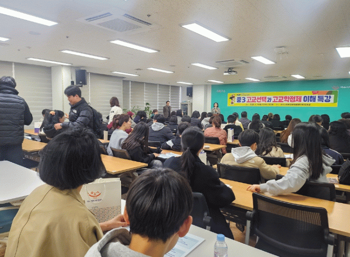 이번 특강은 강남구청 인터넷수능방송, 서울시교육청 교육연구정보원, EBSi 등에서 입시 전문가로 활동하고 있는 김상근 강사가 맡아 고교 선택 전략과 전반적인 고교학점제 가이드맵, 고교생활 준비, 자료 활용법 등을 소개했다.