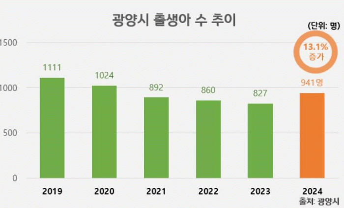 이러한 상황에서 2024년 광양시의 출생아 수는 941명으로 2023년 대비 109명(13.1%)이 증가했고, 출생아 수의 선행지표가 되는 혼인 건수 또한 2024년 880쌍으로 전년 대비 25.9%가 증가했다.