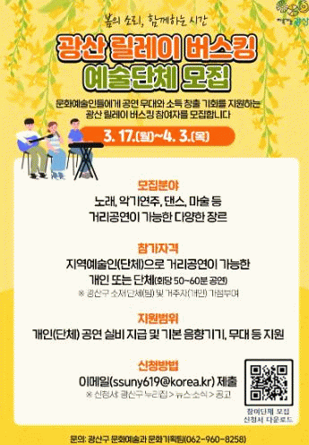 선정된 단체는 5월부터 7월까지 황룡강생태길 30 등 광산구 도심공원 및 골목상가 등에서 거리공연을 펼칠 예정이며, 하반기에도 지속적으로 운영할 예정이다.