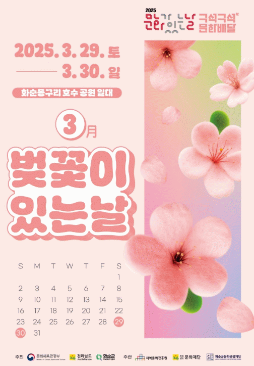 (재)화순군문화관광재단는 오는 29일과 30일 양일간 전남 화순동구리호수공원에서 '벚꽃이 있는 날 Part2' 행사를 기점으로 ‘2025 문화가 있는 날 - 구석구석 문화배달’ 활력촉진형 사업을 시작한다.