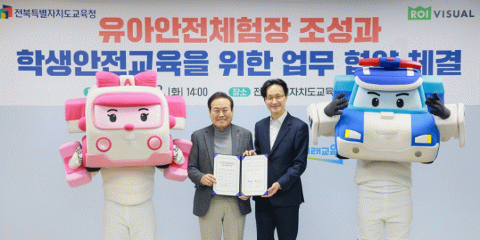 전북교육청은 이날 인명구조 애니메이션 로보카폴리를 제작한 ㈜로이비쥬얼(대표 이동우)와 유아안전체험장 조성과 어린이 안전교육을 위한 업무협약을 체결했다.