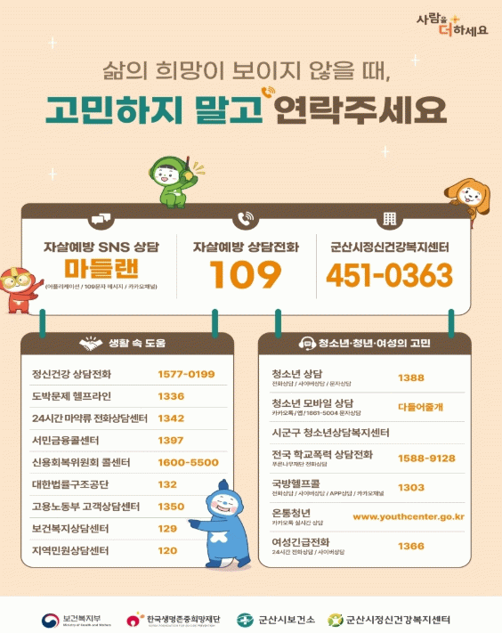 정신적 어려움을 겪고 있어 도움이 필요한 시민은 ▲군산시정신건강복지센터 ▲24시간 자살 예방 상담 전화 ▲정신건강위기 상담 전화 ▲자살 예방 SNS 상담 ‘마들랜’을 통해 언제든지 도움을 받을 수 있다.