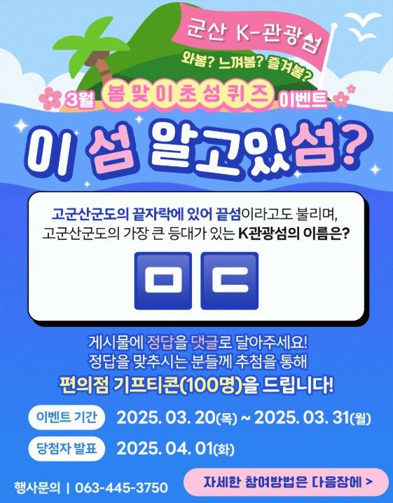 먼저, 3월 20일부터 31일까지 k-관광섬(말도,명도,방축도) 초성 맞추기 퀴즈 이벤트가 열리는데, 군산 k-관광섬 인스타그램 팔로워라면 누구나 참여할 수 있다.