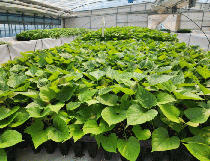 고구마 조직배양묘는 무균실에서 배양되어 식물체로 자란다.