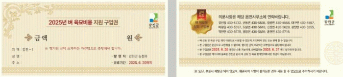 ‘벼 육묘 비용 지원 구입권’은 군에서 지난 2023년부터 벼 육묘용 상토와 육묘 구입으로 제한돼 있던 사용을 농자재 등을 구입이 가능하도록 사용 범위를 확대, 농가들로부터 높은 만족도를 얻고 있다.