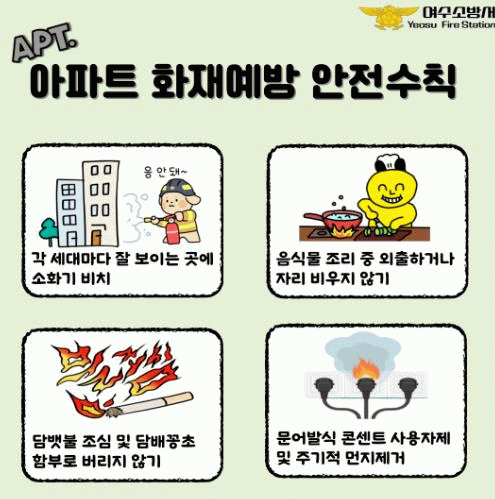 이를 예방하기 위해서 여수소방서에서는 ▲각 세대마다 잘 보이는 곳에 소화기 비치 ▲음식물 조리 중 외출하거나 자리 비우지 않기 ▲담뱃불 조심 및 담배꽁초 함부러 보리지 않기 ▲문어발식 콘센트 사용자제 및 주기적 먼지제거 등의 안전수칙을 소개했다.