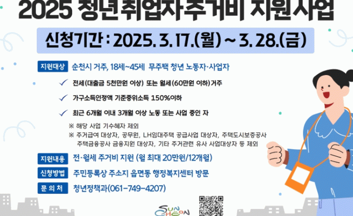 지원 대상은 순천시 거주 18세 이상 45세 이하 무주택 청년으로, 신청일 기준 최근 6개월 동안 3개월 이상의 근로・사업 중인 자이다.