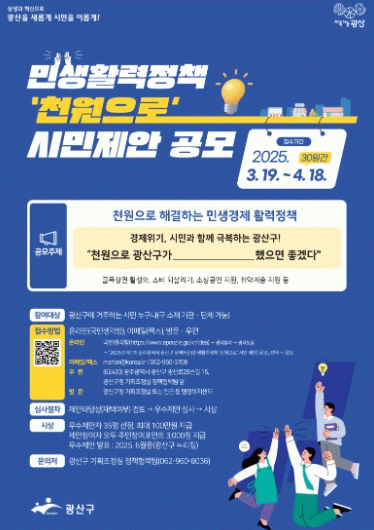 광산구는 19일부터 4월 18일까지 민생 활력 정책 ‘천원으로’ 시민 제안 공모전을 진행한다고 밝혔다.