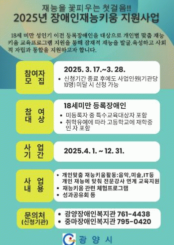 최난숙 노인장애인과장은 “이번 사업이 장애 아동·청소년들의 숨겨진 재능을 발견하고 꽃 피우는 첫걸음이 될 것”이라며, “각자 가지고 있는 재능과 능력을 최대한 계발해 사회에 능동적으로 참여할 수 있는 발판이 되기를 바란다.”고 전했다.
