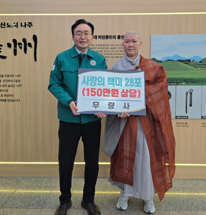 이날 기탁식에는 윤병태 나주시장과 하담 주지스님이 참석했다. 하담스님은 “작은 정성이지만 어려운 이웃들에게 따뜻한 위로가 되길 바란다”며 “앞으로도 지속적으로 관심을 갖고 나눔을 실천하겠다”고 말했다.