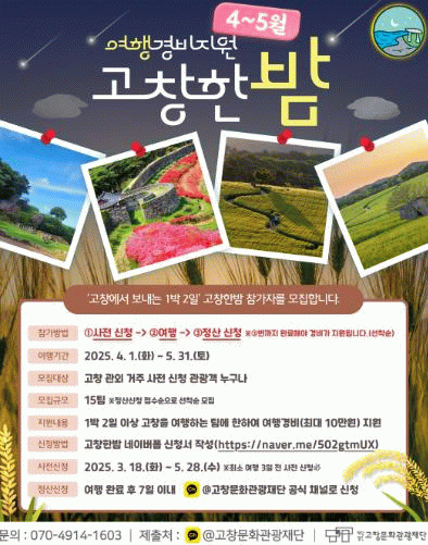 고창한밤은 4~5월 15팀을 선정해 여행경비를 지원할 예정이다.