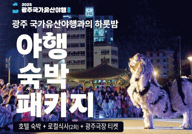 야행 숙박패키지는 ‘광주아트패스’ 누리집 또는 앱을 통해 총 50명을 대상으로 선착순 판매하며, 1인 10만 원, 2인 14만 원(특가)에 구입할 수 있다.