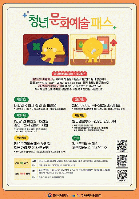 청년문화예술패스는 사회에 첫발을 내딛는 대한민국 19세 청년에게 공연 · 전시 관람비를 지원하는 것으로,