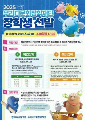 장학금 신청은 오는 3월 24일부터 4월 18일까지 진행되며, 신청을 원하는 학생은 우리다문화장학재단 홈페이지를 통해 온라인으로 신청할 수 있다.