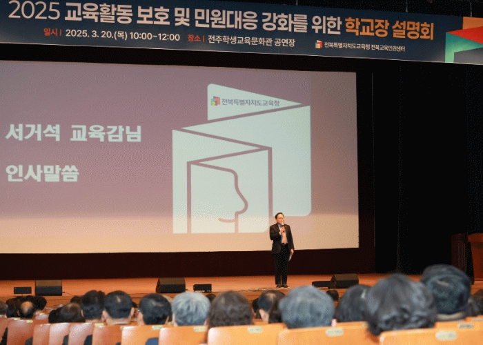도내 유․초․중․고․특수학교 교(원)장 900여 명을 대상으로 한 이날 설명회는 2025 전북교육청 10대 핵심과제인 교육활동 보호에 대한 현장 이해도와 민원 대응 역량 강화가 목적이었다.