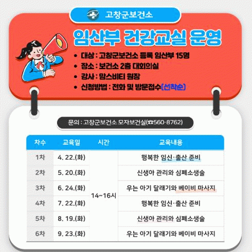 유병수 고창군 보건소장은 “출산과 육아를 준비하는 가정에 실질적인 도움을 줄 수 있는 다양한 프로그램을 마련했다”며 “건강한 출산과 행복한 육아를 돕기 위한 이번 프로그램에 많은 관심과 참여를 부탁 드린다”고 전했다.