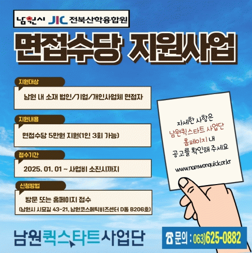 최경식 남원시장은 “남원 시민들이 면접비 걱정을 덜고 활발하게 구직활동에 참여할 수 있도록 면접 수당을 인상했다”라며 “남원형 퀵스타트 사업을 통해 일자리를 구하는 시민과 인재를 필요로 하는 기업의 일자리 매칭을 적극 지원하여 남원 일자리 창출에 최선을 다하겠다.”라고 밝혔다.