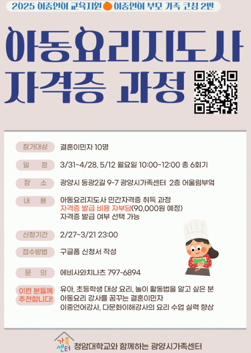 한편, 광양시가족센터는 결혼이민자를 위한 다양한 프로그램을 개발하고 지원하고 있으며 이번 아동요리지도사 교육 과정 ‘쿡쿡! 엄마랑 함께하는 요리 놀이’에 대한 자세한 사항은 광양시가족센터 홈페이지를 통해 확인할 수 있다.