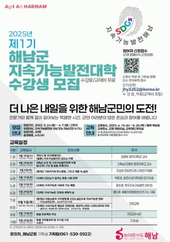 제1기 해남군 지속가능발전대학의 수강생은 4월 7일까지 모집한다.
