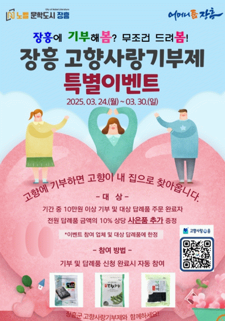 행사에 참여하는 방법은 고향사랑 e음(온라인)에 접속하거나 농협은행을 방문해 장흥군에 10만원 이상 기부하면 된다.