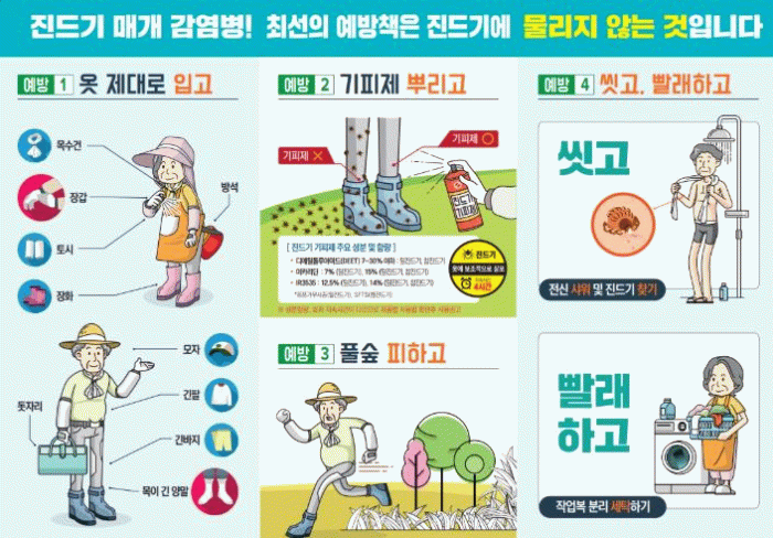 마지막으로 야외활동 또는 농작업 후에는 ▲ 귀가 즉시 옷은 털어서 세탁하기 ▲ 샤워(목욕)하면서 몸에 벌레 물린 상처 또는 진드기가 붙어있는지 확인하기 ▲ 발열 등 증상 발생 즉시 보건소 또는 의료기관 방문하여 진료받기이다.