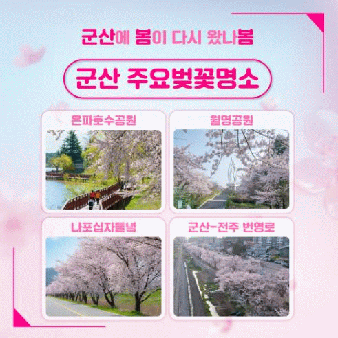 군산시가 추천하는 주요 벚꽃 명소는 반짝이는 호수 주변을 따라 화사한 벚꽃길을 자랑하는 은파호수공원, 50년 수령의 큼직한 벚나무들이 벚꽃 터널을 이루고 있는 월명공원, 일렁이는 핑크 꽃물결이 장관을 이루는 군산-전주 번영로(26번 국도), 한적한 시골 풍경과 함께벚꽃 드라이브를 즐길 수 있는 나포 십자 들녘까지 다른 매력을 가진 명소들이 곳곳에 위치 해있다.