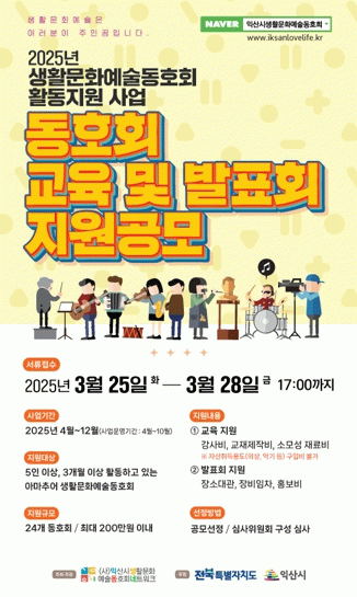 익산시는 ㈔익산시생활문화예술동호회네트워크가 오는 28일까지 '2025년 생활문화예술동호회 활동지원사업'에 참여할 동호회를 모집한다고 24일 밝혔다.