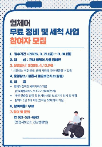 정읍시에 거주하는 휠체어 사용자라면 누구나 신청할 수 있으며, 접수 기간은 오는 3월 31일까지다.