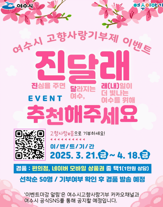 이벤트는 선착순 50명을 대상으로 하며, 당첨자 발표는 4월 30일 이후 개별 연락 및 카카오 채널 '여수사랑고향사랑기부제'를 통해 공지된다.