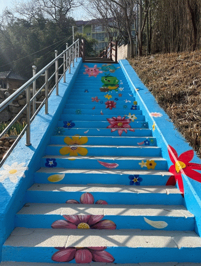 데크계단 입구에는 하늘색 바탕에 영암군 캐릭터인 남생이와 달토끼, 산이를 포함해 다양한 꽃을 그려 넣어 포토존 역할도 하도록 꾸몄다.