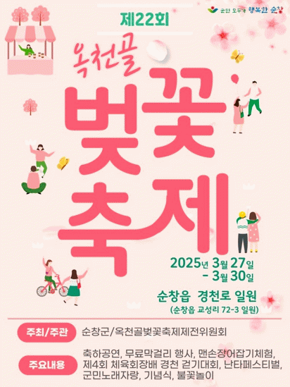 올해로 22회를 맞이하는 이번 축제는 순창군이 주최하고 옥천골벚꽃축제제전위원회가 주관하며, 매년 많은 사람들이 찾는 인기 축제인 만큼 올해도 더욱 알차고 다양한 프로그램들로 방문객들을 맞이할 예정이다.