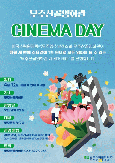 “무주산골영화관 시네마 데이”는 군민의 새로운 문화 경험을 위해 다양한 문화 활동을 적극 지원(사회공헌 활동)하기 위해 산골영화관과 한국수력원자력(주) 무주양수발전소가 함께 진행하는 것으로, 자세한 내용은 무주산골영화관 홈페이지 및 SNS 등을 통해 확인할 수 있다.
