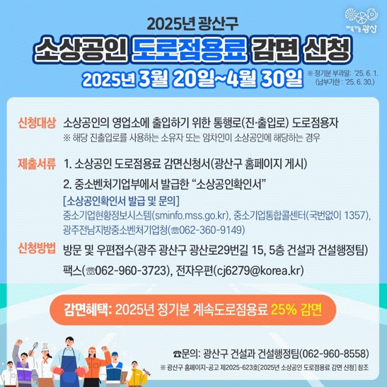 소상공인 도로점용료 감면 신청 및 정기분 도로점용료 부과에 대한 자세한 사항은 광산구 건설과 건설행정팀)으로 문의하면 된다.