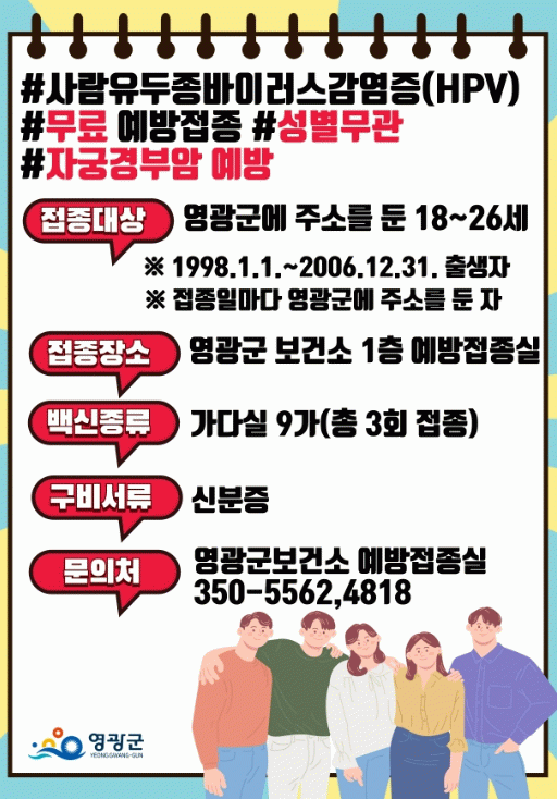 영광군 보건소 관계자는 “예방접종 비용 부담이 큰 만큼 접종을 지원받을 수 있는 시기의 청년층 대상자들이 빠짐없이 참여하여 접종해주길 바란다.”라고 말했다.