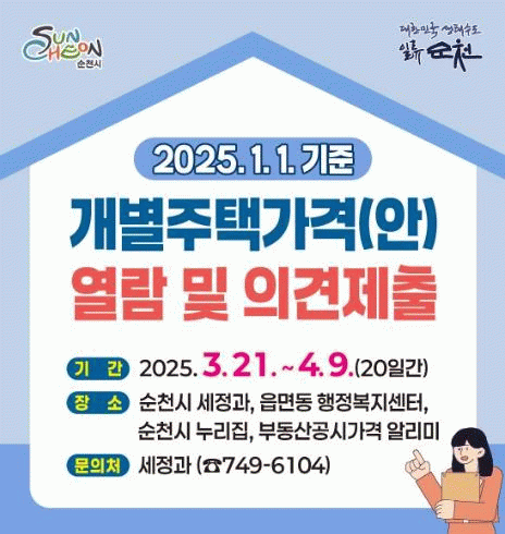 제출된 의견은 개별주택의 특성, 적정가격, 인근 주택과의 가격 균형 등을 종합적으로 검토한 뒤 순천시 부동산가격 공시위원회의 심의를 거쳐 개별 통지하고, 최종 확정된 개별주택 가격은 4월 30일에 공시할 예정이다.