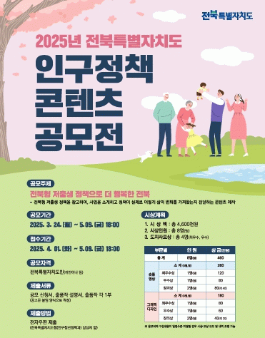 전북자치도 관계자는 “이번 공모전을 통해 도민들의 창의적인 아이디어를 발굴하고, 인구 문제 해결에 대한 관심과 공감대를 확산할 수 있기를 기대한다”며, “도민 여러분의 많은 관심과 참여를 부탁드린다”고 말했다.