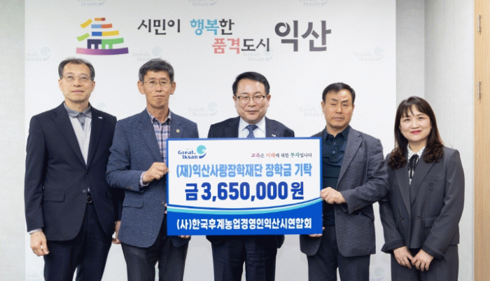 이날 기탁된 장학금은 지역 인재 육성과 교육 환경 조성에 기여하고자 ㈔한국후계농업경영인익산시연합회 회원들이 십시일반 정성을 모아 마련한 것이다. 한농연의 장학금 기부는 올해로 5년째 이어지고 있다.